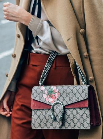 Gucci在Alessandro Michele執掌之後簡直迷幻,不僅設計上蹭蹭蹭的變時髦,掀起時尚圈第一波熱浪的正是Dionysus 酒神包。經典老花搭配 Alessandro Michele 標誌性的花卉印花,亮眼的風琴包結構,在麂皮陪襯上顯得非常文藝, 幾乎是時尚人士們的標(bao)配(kuan)包!